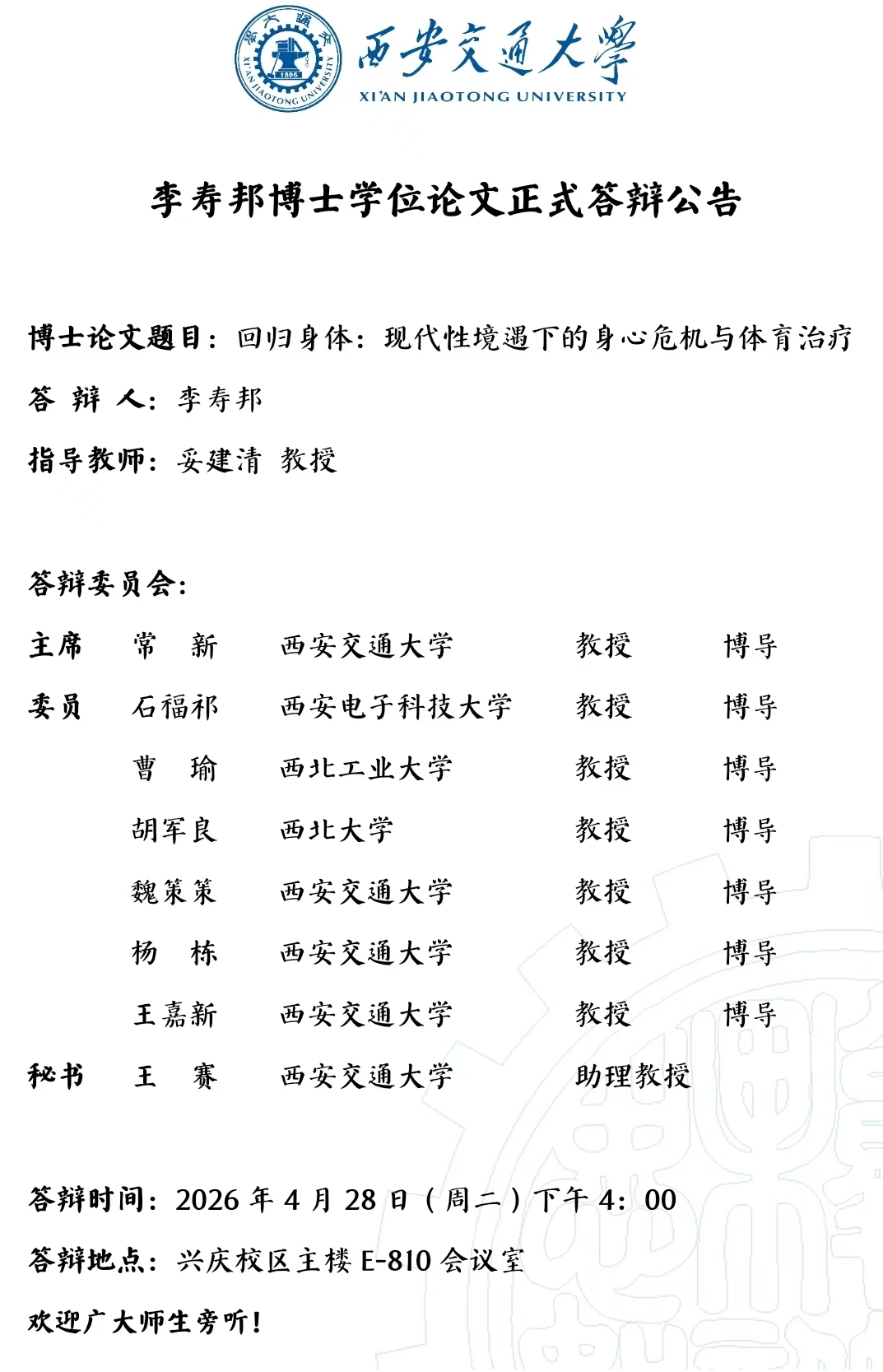 李寿邦博士学位论文正式答辩公告