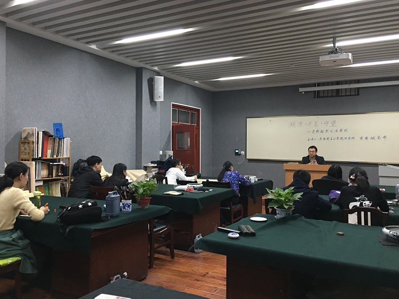 2016年11月16日晚的东二楼401教室学术氛围浓郁。应中国书法系党支部邀请,来自马克思主义学院历史所的宋希斌老师为书法系教师及硕博研究生带来一场题为“溯源·寻觅·守望”的讲座,旨在引导大家明晰史料的检索方法,助力学科学术研究。