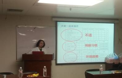 黎黎副教授为大家讲授了干眼的症状、危害以及导致干眼的因素如用眼习惯、环境因素等,谈到老年人和女性得干眼症的几率更大,过度使用手机、佩戴隐形眼睛、眼部手术等因素都有可能导致干眼症。