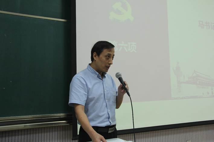 第二个环节,马克思主义学院副教授、博士生导师、院长助理韩锐为全体党员做题为《千锤百炼更坚强——用铁的纪律管党治党》的专题讲座。他在讲座中指出,“守纪律”是党员干部的立业之基,“讲规矩”是党员干部的为政之要,共产党员应该严格要求自己,不断强化信仰意识,加强自身学习,严格依法办事,成为信仰坚定、敢于担当、有所作为的优秀教育工作者。