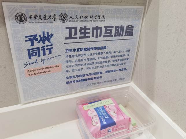 巾帼不让须眉好。为关注女性身心健康,帮助女性树立正确生理观,消除月经羞耻,宣传两性平等理念,团支部在创新港第一家举办了“Stand by her予她同行”的活动,在创新港涵英楼四层中厅女性卫生间设置卫生巾互助盒,以“取一放一”为原则,实现女性特殊时期的“卫生巾互助”。