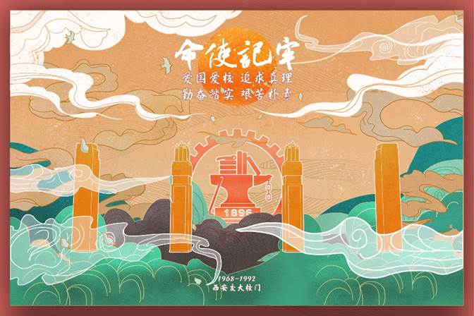 作为新时代的交大研究生,我们应牢记使命,弘扬校风,传承西迁精神。本幅作品整体风格偏古韵朴拙,将第三时期的校门嵌于国风插画之中,表达校门的历史感,突出校园文化的博大精深,此构图也体现了主题文字中“牢记使命”的“神圣感”。